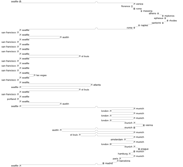 In the ten months from mid-August 2009 to mid-July 2010, I travelled over 91,000 miles in inter-city trips. That’s nearly 4 trips around Earth, and an average velocity of 20 mph during waking hours, mostly via aircraft.
